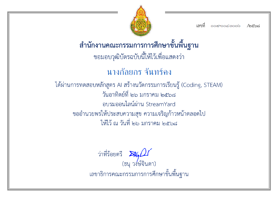 เกียรติบัตรAI สร้างนวัตกรรมการเรียนรู้ด้วยCODING